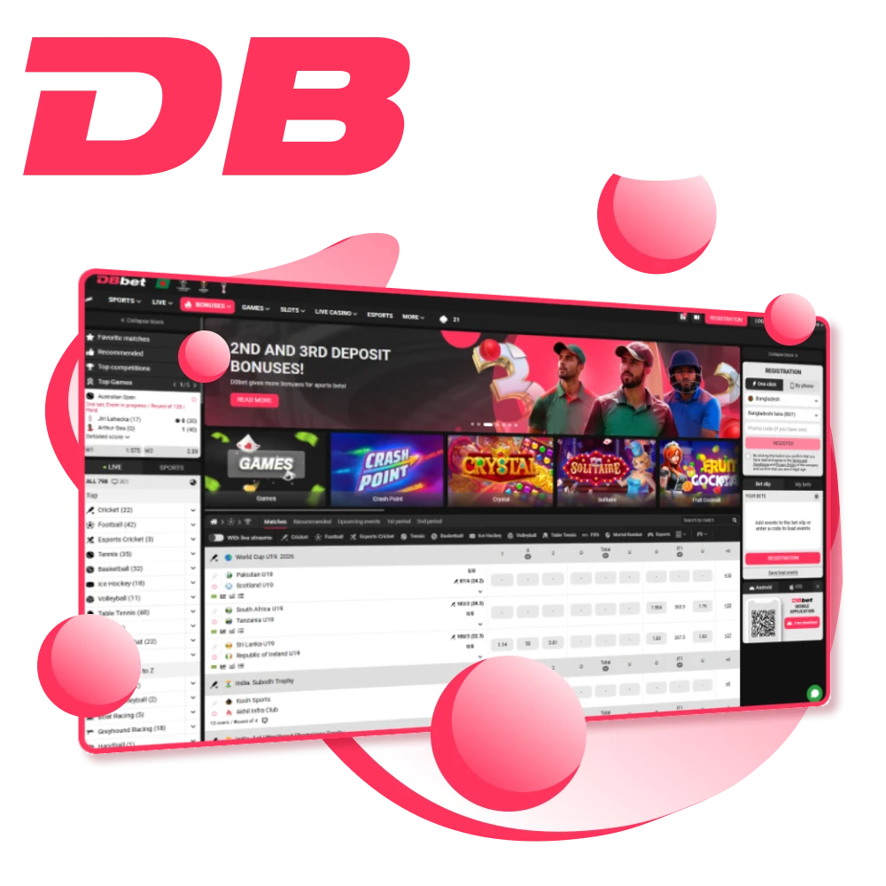 বাংলাদেশি ব্যবহারকারীদের জন্য DBBet ওয়েবসাইটের ইন্টারফেস সহজ ও পরিচিত বিন্যাসে সাজানো। উপরের নেভিগেশন বারে আপনি স্পোর্টস, লাইভ বেট, ক্যাসিনো, লাইভ ক্যাসিনো, ইস্পোর্টস, প্রোমো, সাপোর্ট এবং লগইন/রেজিস্ট্রেশন অংশ এক ক্লিকেই পেয়ে যান, আর হোম পেইজ থেকেই জনপ্রিয় ম্যাচ ও ক্যাসিনো গেম দেখা যায়।